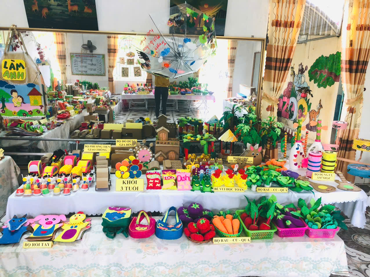 Từ những chiếc chai nhựa đã qua sử dụng, vỏ hộp sữa, bìa carton cũ, vải vụn… tưởng chừng như vô dụng, qua đôi bàn tay tài hoa và khối óc sáng tạo của các cô giáo, chúng đã “hóa thân” thành những sản phẩm vô cùng sinh động và hấp dẫn. Các sản phẩm dự thi tập trung vào nhiều lĩnh vực như Phát triển vận động, Làm quen với Toán, Khám phá Khoa học – Xã hội, Phát triển ngôn ngữ, và các góc chơi sáng tạo (góc phân vai, góc thiên nhiên…) Điểm nổi bật là hầu hết các bộ đồ dùng đều có tính ứng dụng cao, phục vụ trực tiếp và hiệu quả cho các hoạt động chăm sóc, giáo dục trẻ ở từng độ tuổi. Từ những bộ “rau, củ, quả”, “Phương tiện giao thông” chi tiết, những “Bộ đồ dùng Âm nhạc” ngộ nghĩnh, đến các trò chơi với chữ cái, chữ số được làm từ vật liệu tái chế… tất cả đều thể hiện sự đầu tư nghiên cứu kỹ lưỡng về nội dung và phương pháp giáo dục.
